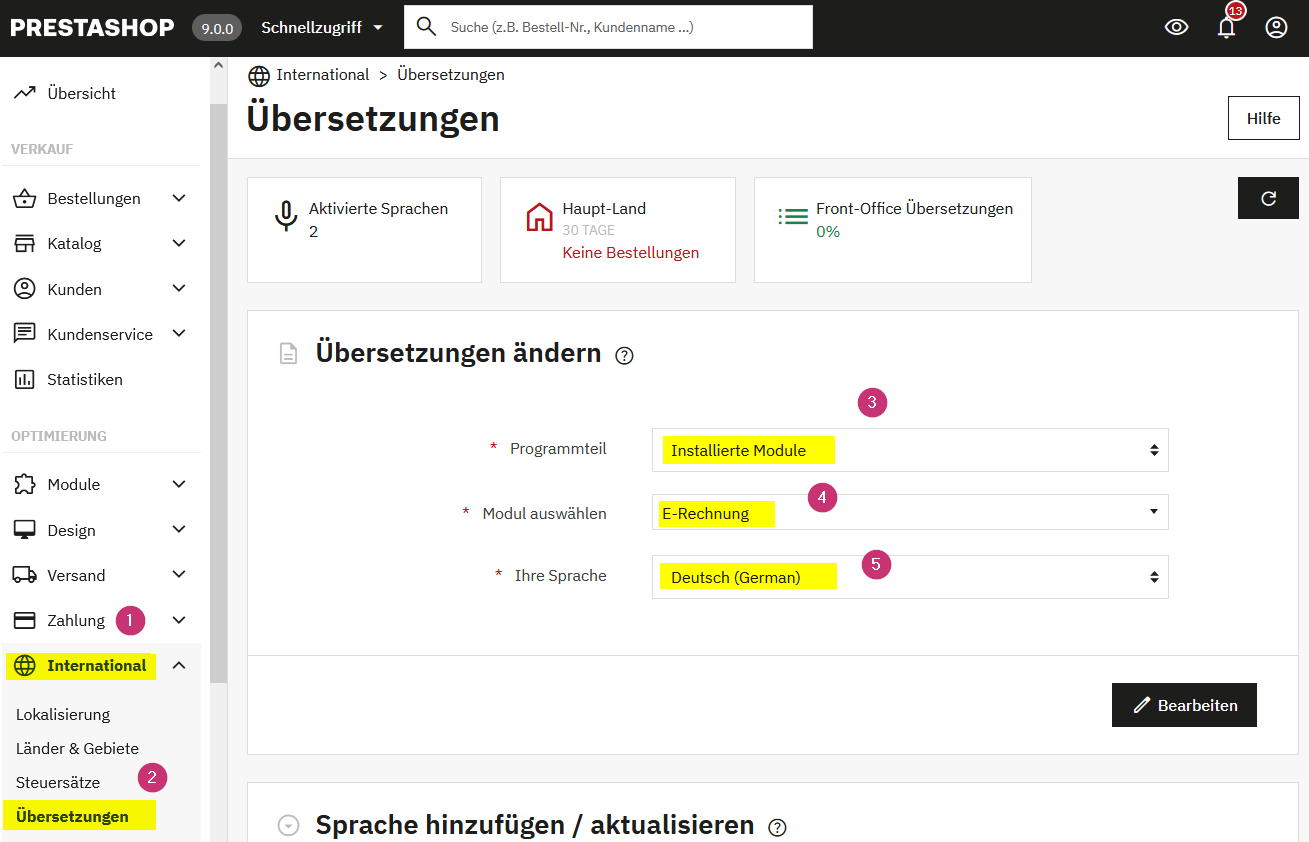 Das Modul kann in alle verfügbaren Sprachen übersetzt werden. Standardmäßig sind Deutsch und Englisch enthalten. Um eine Übersetzung vorzunehmen, gehen Sie im Menü links auf „International“ (1) und anschließend auf „Übersetzungen“ (2). Wählen Sie im Bereich „Programmteil“ die Option „Installierte Module“ (3), anschließend das gewünschte Modul (4) und die gewünschte Sprache (5). Klicken Sie danach auf „Bearbeiten“, um die Übersetzung anzupassen.