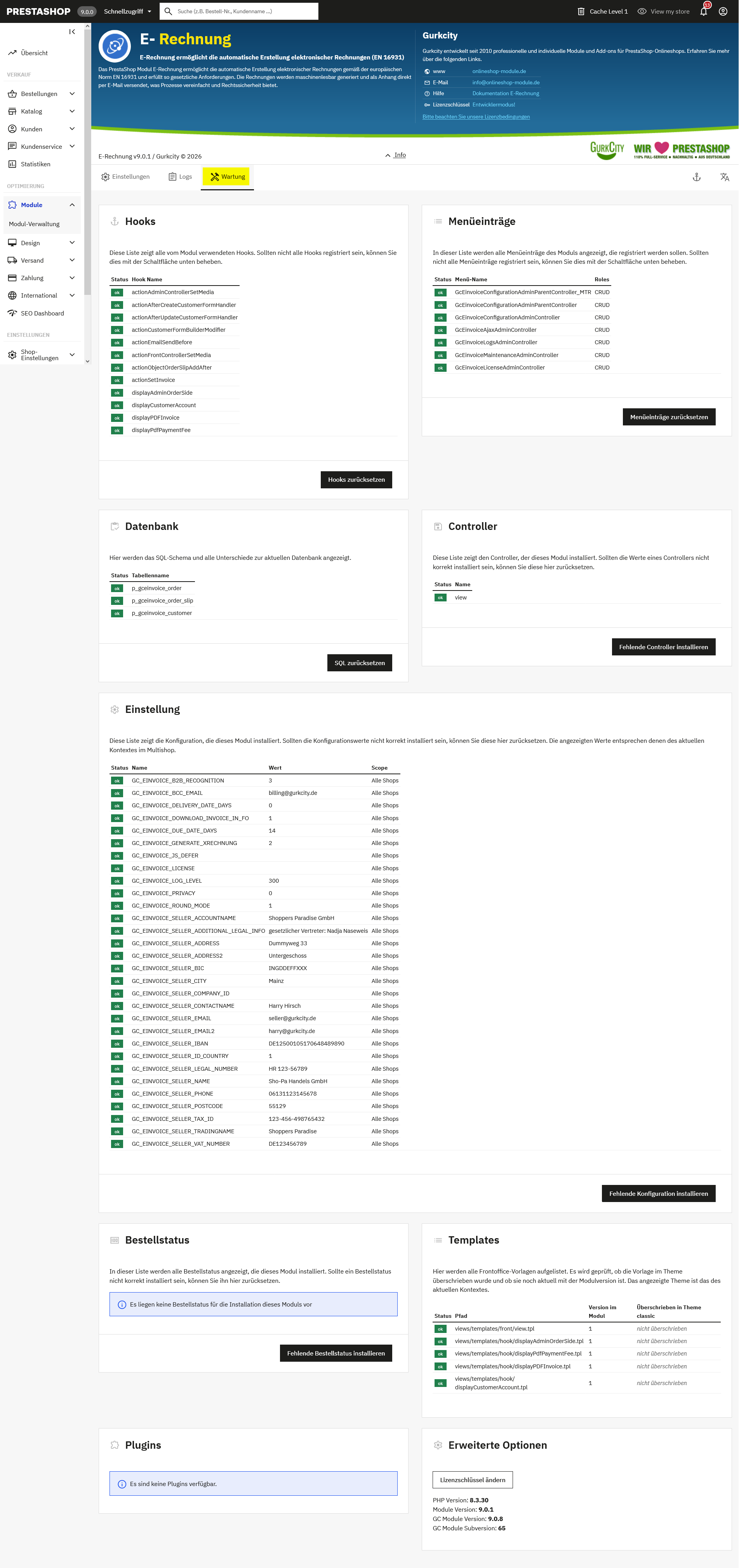 Der Tab "Wartung" bietet Shopbetreibern eine Übersicht über die technische Integrität des Moduls. Er hilft dabei, mögliche Fehlerquellen zu identifizieren und fehlerhafte Installationen von Hooks, Menüeinträgen, Datenbankstrukturen oder Templates schnell zu beheben.