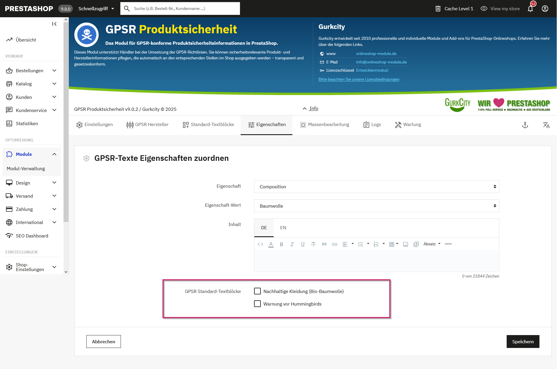 Im Tab „GPSR-Texte zu Eigenschaften“ werden Textbausteine verwaltet, die direkt bestimmten Produkteigenschaften zugeordnet werden können, um relevante Informationen automatisch auf den Produktseiten anzuzeigen.
