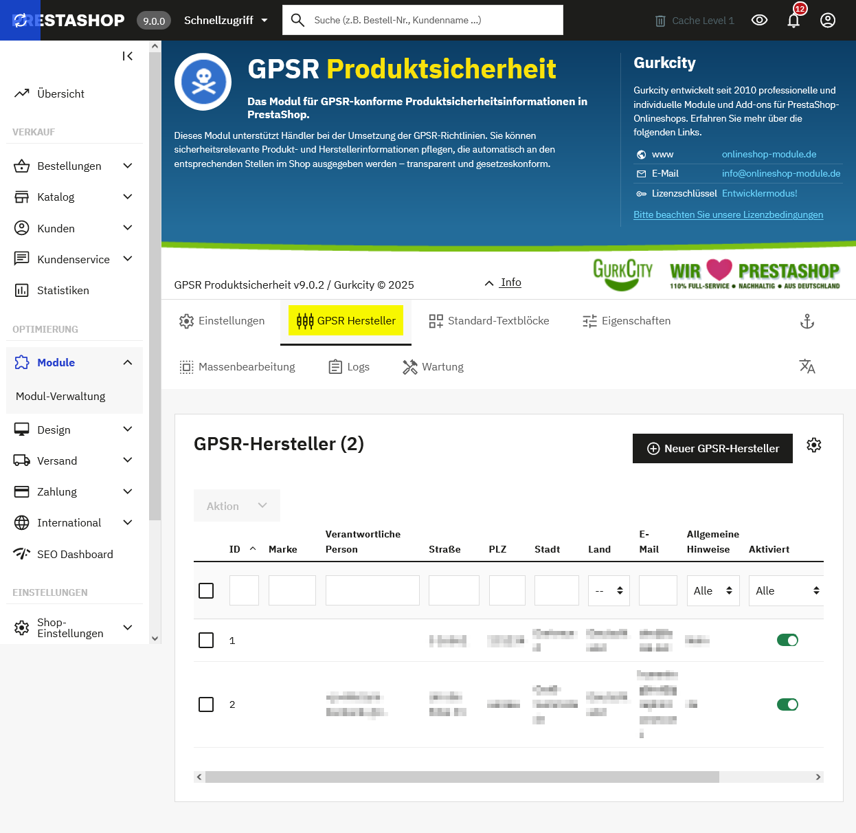 Im Tab „GPSR-Hersteller“ werden alle für die GPSR-rechtlichen Angaben relevanten Hersteller oder verantwortlichen Personen zentral verwaltet