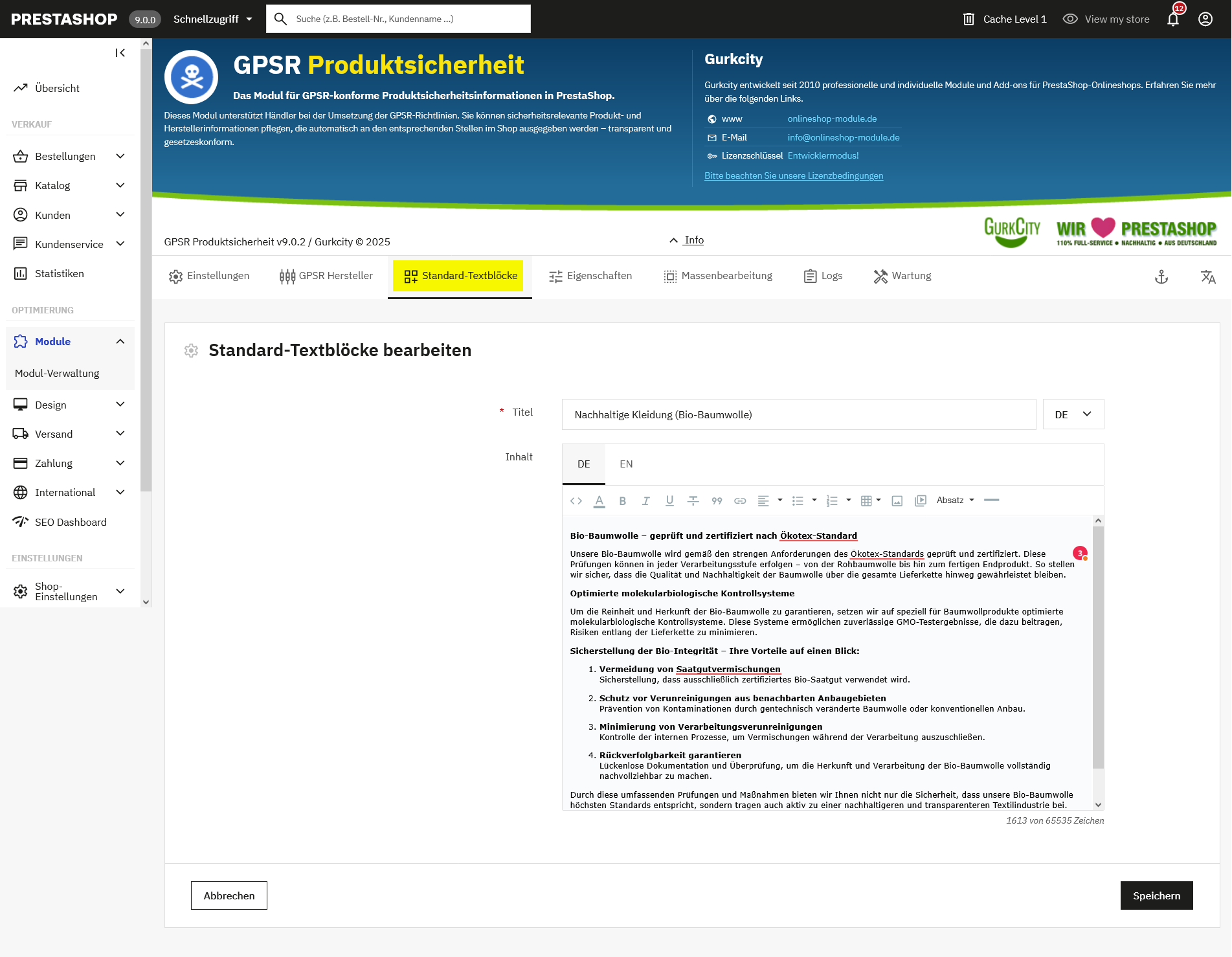 Im Tab „GPSR Standard-Textblöcke“ können individuelle Textbausteine angelegt, die auf Produktseiten angezeigt werden können, um rechtliche Hinweise, Sicherheitshinweise oder Zusatzinformationen gemäß GPSR darzustellen.