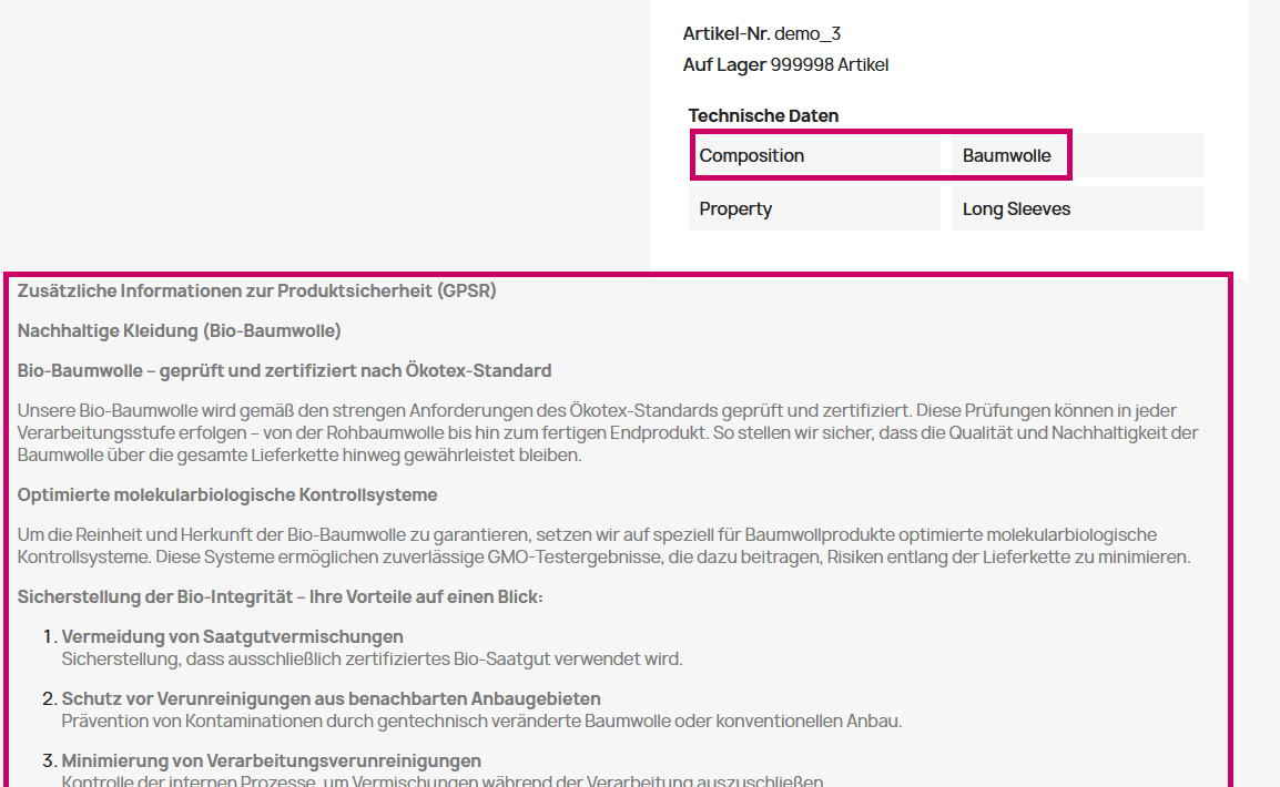 Wichtig in dem Zusammenhang ist, dass die Artikel mit den Eigenschaften und Eigenschaftenwerten zugewiesen sind. Jeder Artikel, der nachträglich ergänzt wird und diese Eigenschaftswerte hat, bekommt automatsch den and die Eigenschaft gekoppelten GPSR-Text.