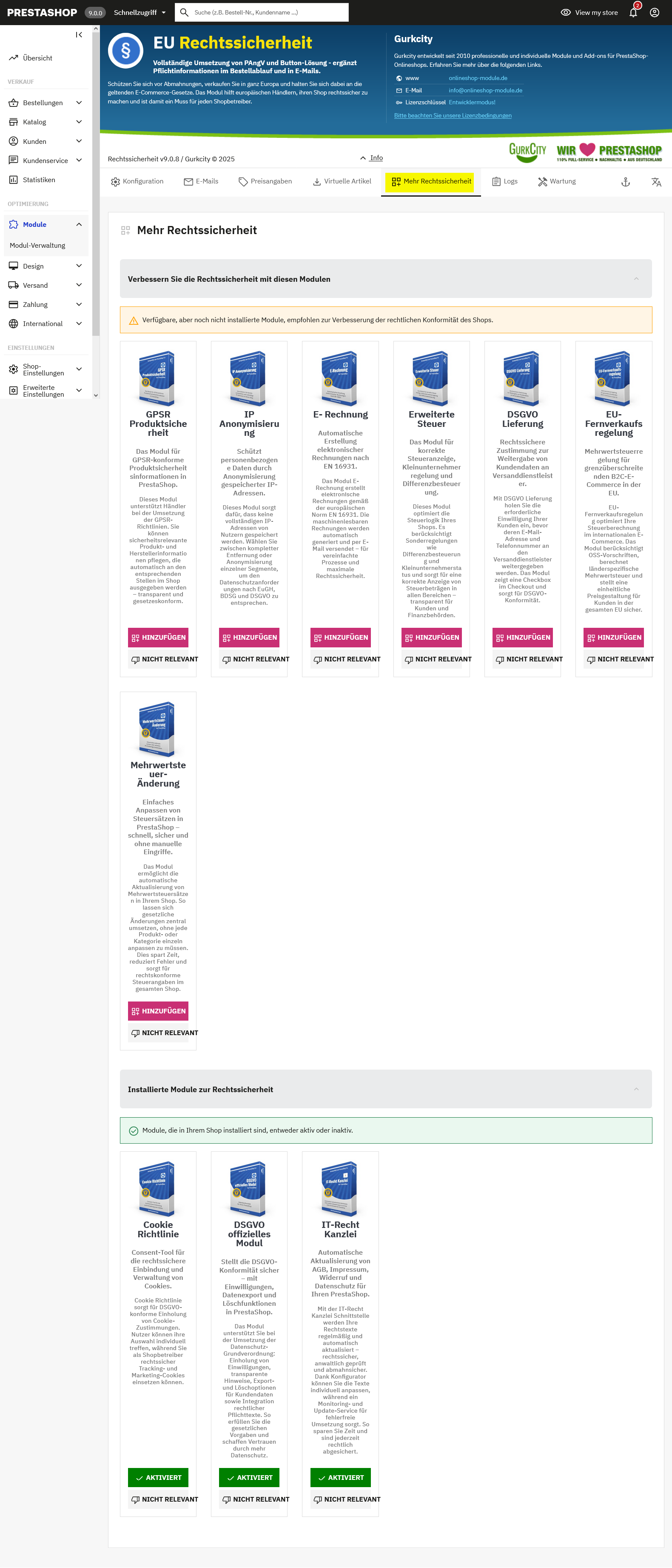 Im Tab "Mehr Rechtssicherheit" erhalten Sie eine Übersicht über zusätzliche Module, die den rechtlichen Schutz und die Konformität Ihres Shops weiter verbessern. Neben verfügbaren, noch nicht installierten Modulen werden auch bereits installierte Module angezeigt.