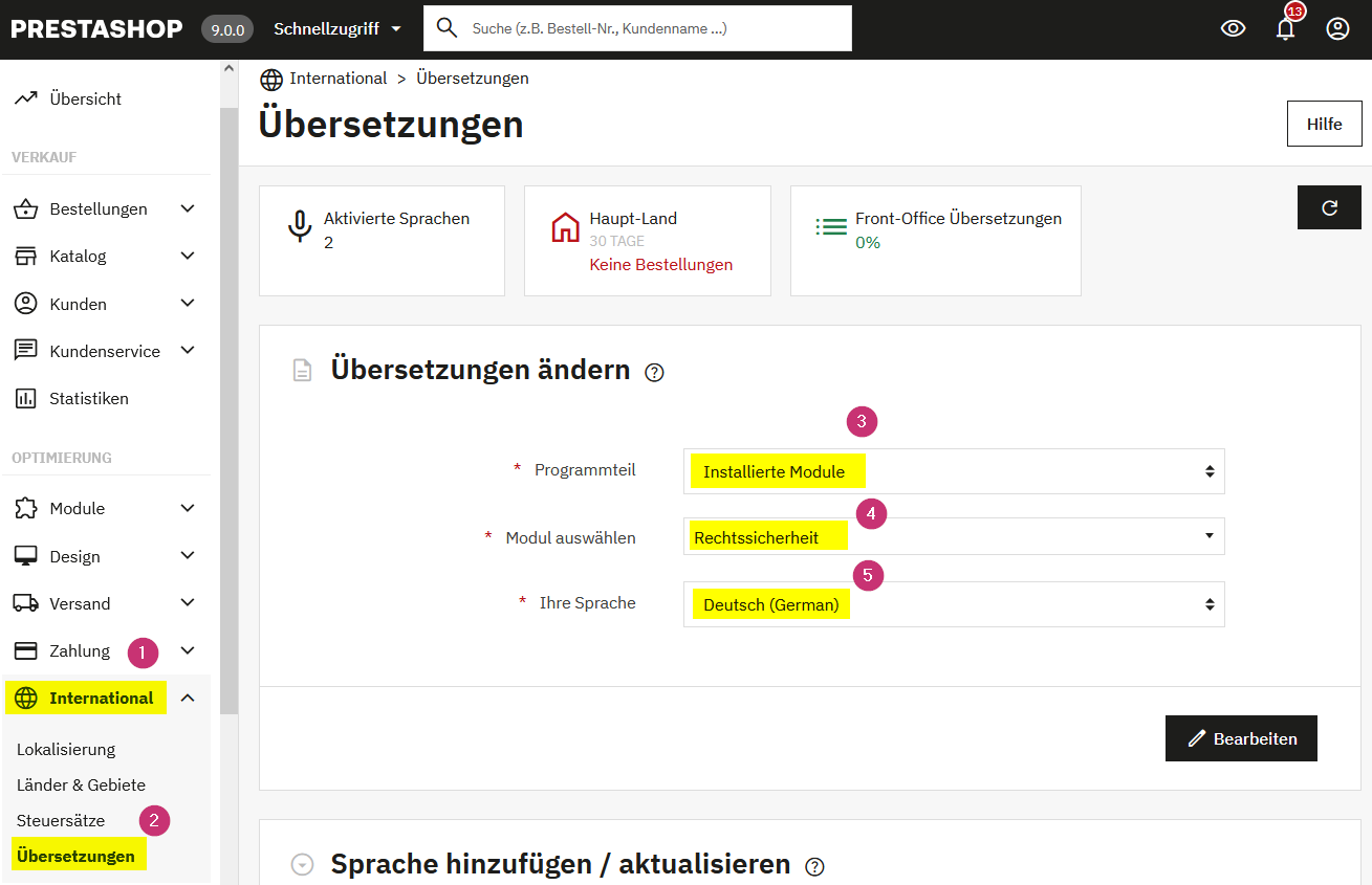 Das Modul kann in alle verfügbaren Sprachen übersetzt werden. Standardmäßig sind Deutsch und Englisch enthalten. Um eine Übersetzung vorzunehmen, gehen Sie im Menü links auf „International“ (1) und anschließend auf „Übersetzungen“ (2). Wählen Sie im Bereich „Programmteil“ die Option „Installierte Module“ (3), anschließend das gewünschte Modul (4) und die gewünschte Sprache (5). Klicken Sie danach auf „Bearbeiten“, um die Übersetzung anzupassen.