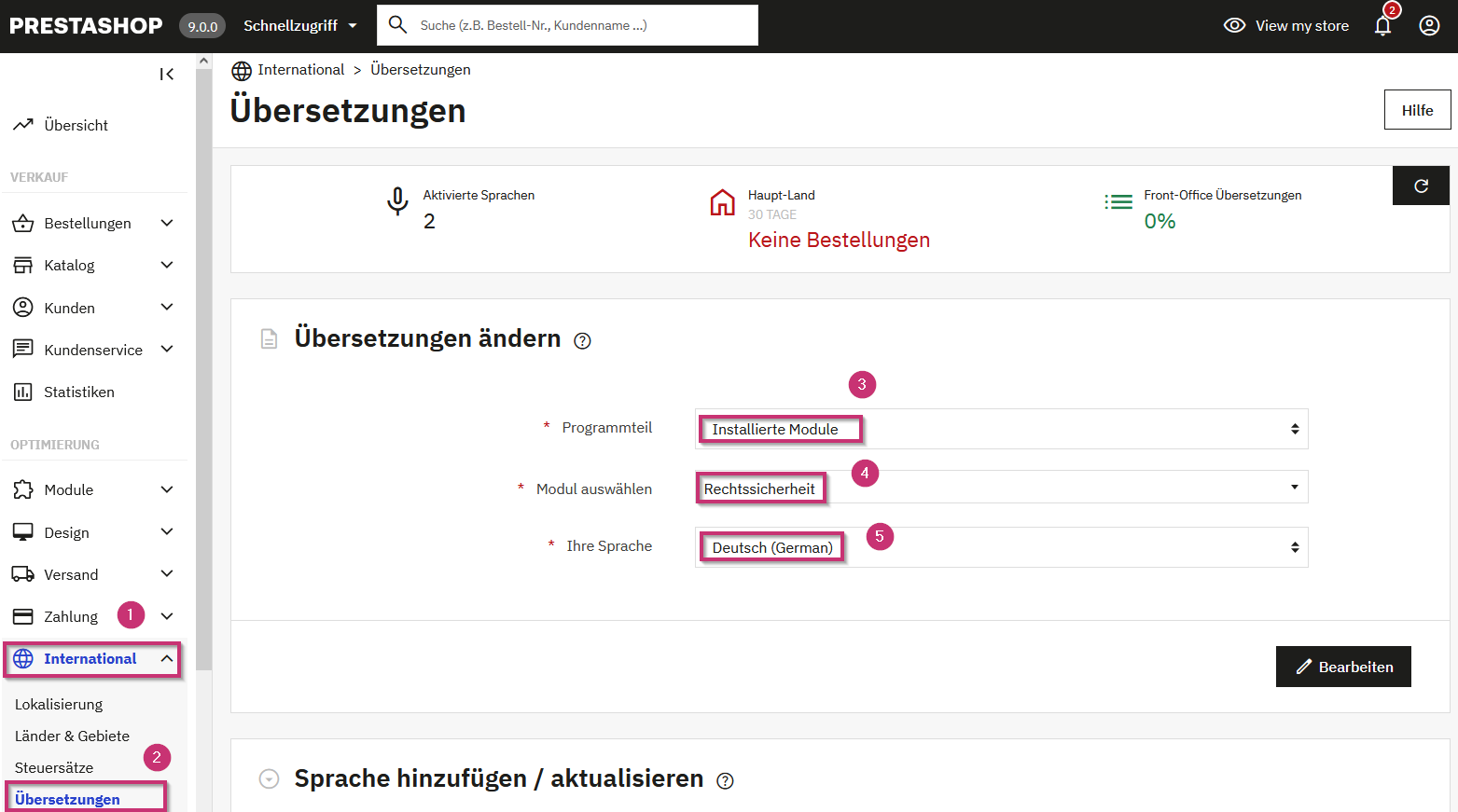 Um Verfügung.eine WählenÜbersetzung vorzunehmen, gehen Sie dazu links im Menü denlinks Punktauf "International"„International“ (1) und anschließend auf "Übersetzungen"„Übersetzungen“ (2) aus. Im Programmteil klicken.