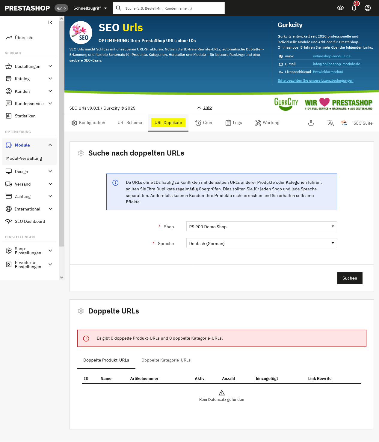 Funktion: Startet eine Prüfung aller Produkt- und Kategorie-URLs auf Mehrfachverwendungen innerhalb des Shops. Dabei wird die aktuelle Shop- und Sprachkonfiguration berücksichtigt.