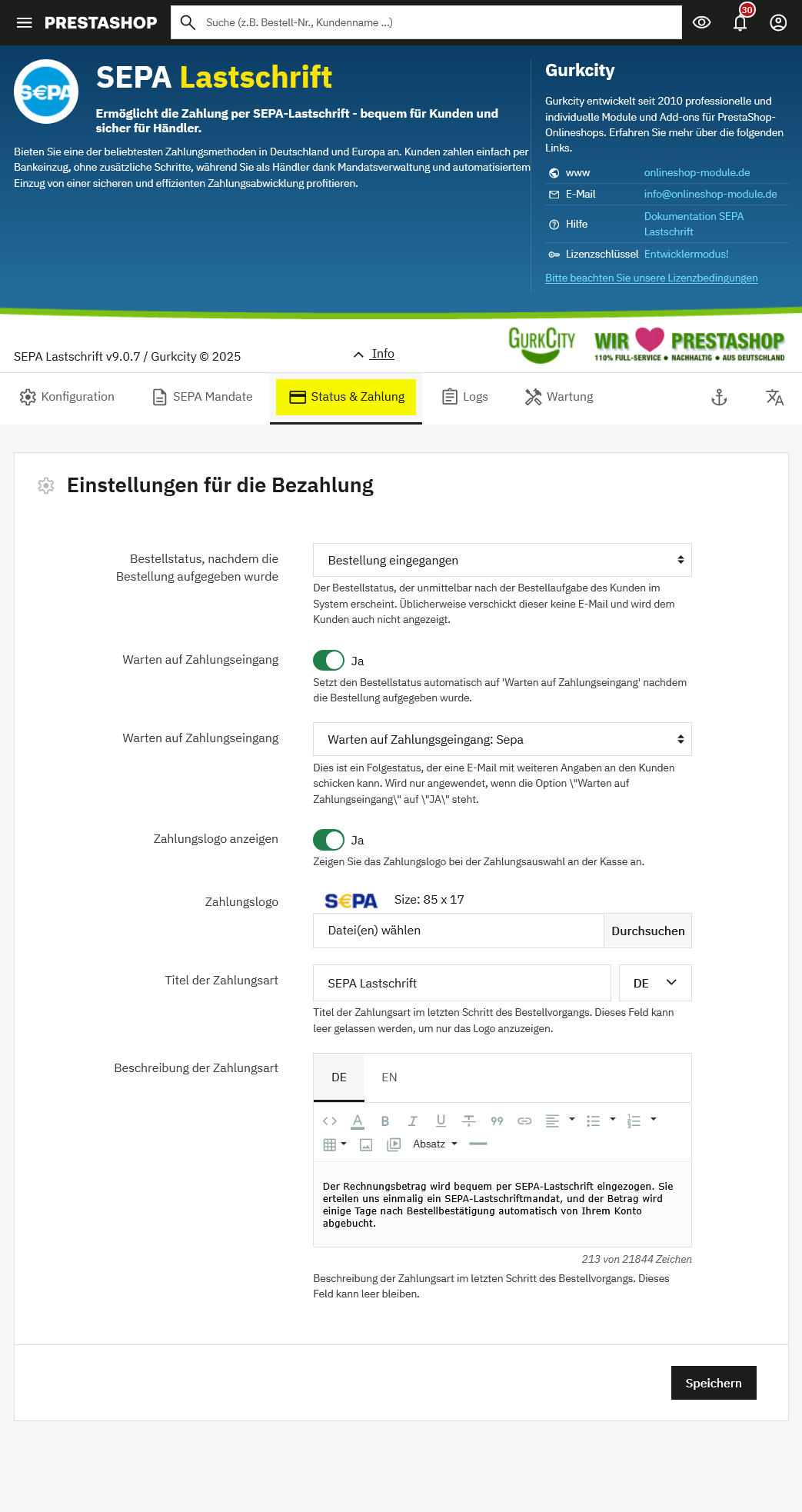 Im Tab „Status & Zahlung“ legen Sie fest, wie das SEPA-Lastschrift-Modul im Bestellprozess angezeigt und nach Abschluss einer Bestellung verarbeitet wird. Hier steuern Sie insbesondere den Bestellstatus, Anzeigeoptionen an der Kasse und Texte der Zahlungsart.